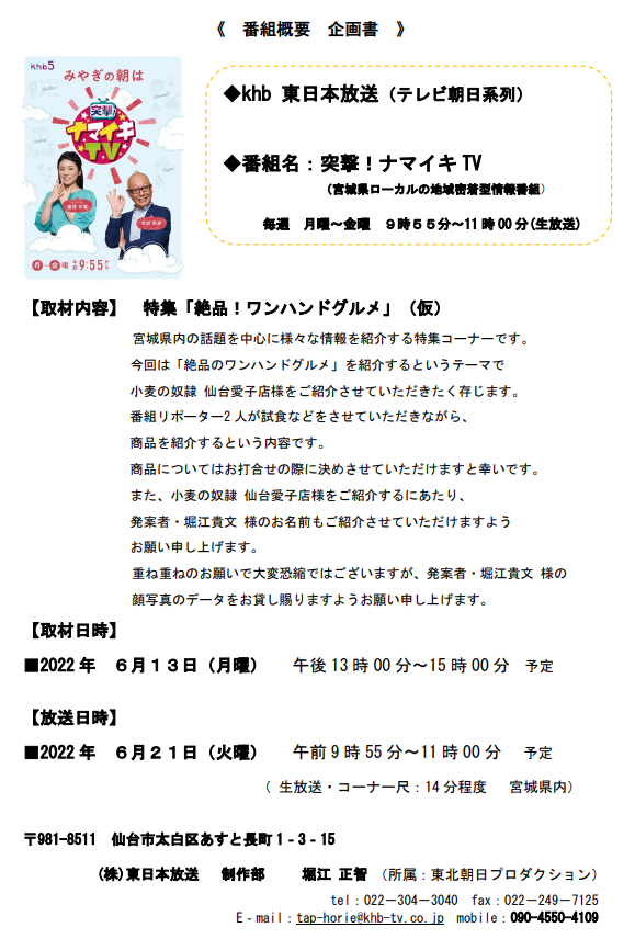 東日本放送「突撃!ナマイキTV」-小麦の奴隷 仙台愛子店